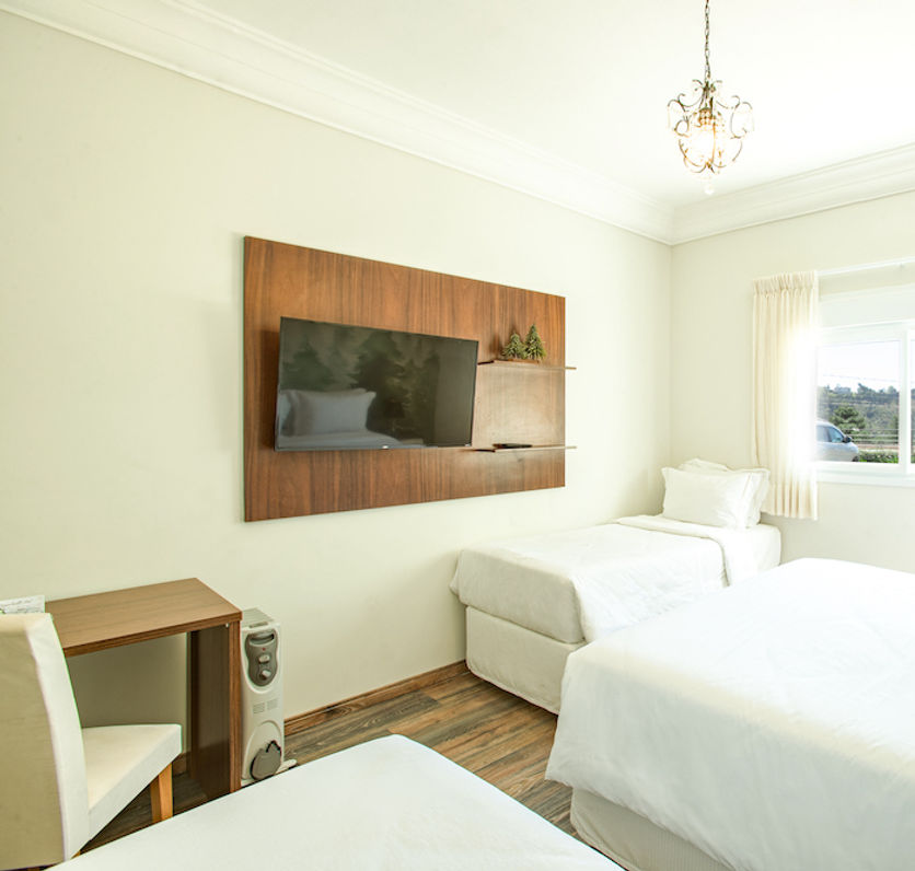 Acomodações modernas e confortáveis. Todas as unidades possuem cama queen size com enxoval 100% algodão e 300 fios, Smart TV de 43”, frigobar, ducha a gás, banheiro com piso aquecido, amenidades de banho e aquecedor elétrico.